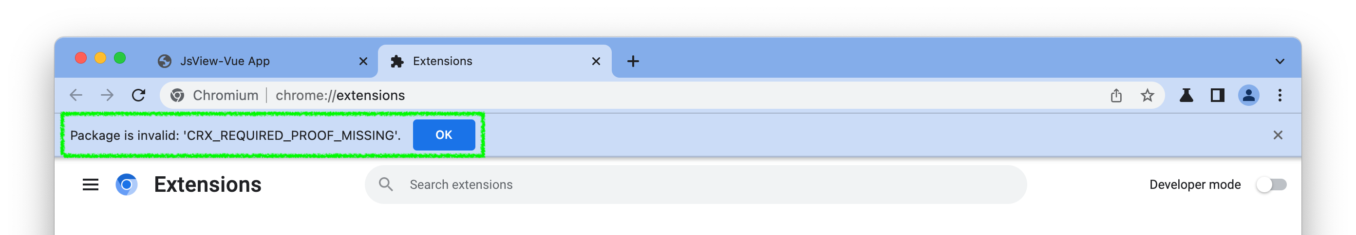 如果在安装过程中出现如下图的 Package is invalid: 'CRX_REQUIRED_PROOF_MISSING' 错误,可以通过如下方式解决: