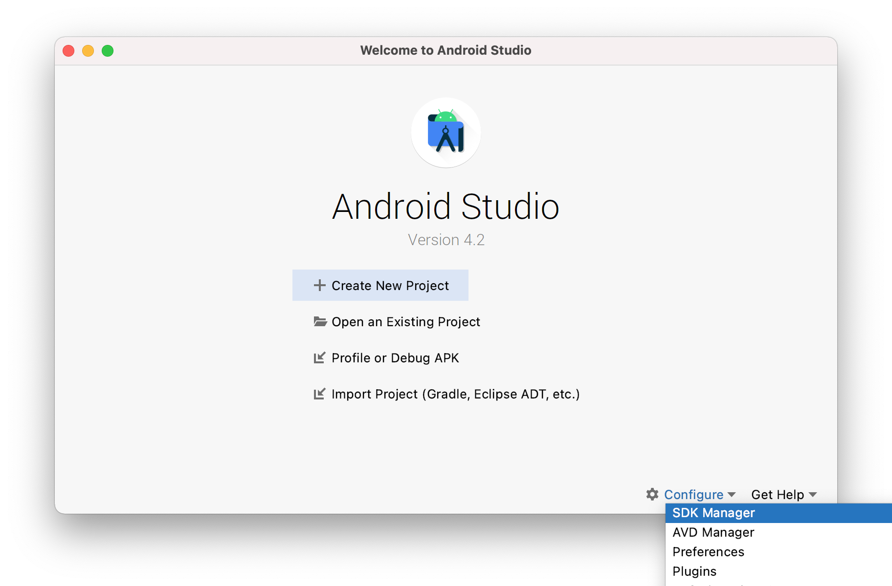 你可以在 Android Studio 的欢迎界面中找到 SDK Manager。点击"Configure",然后就能看到"SDK Manager"。