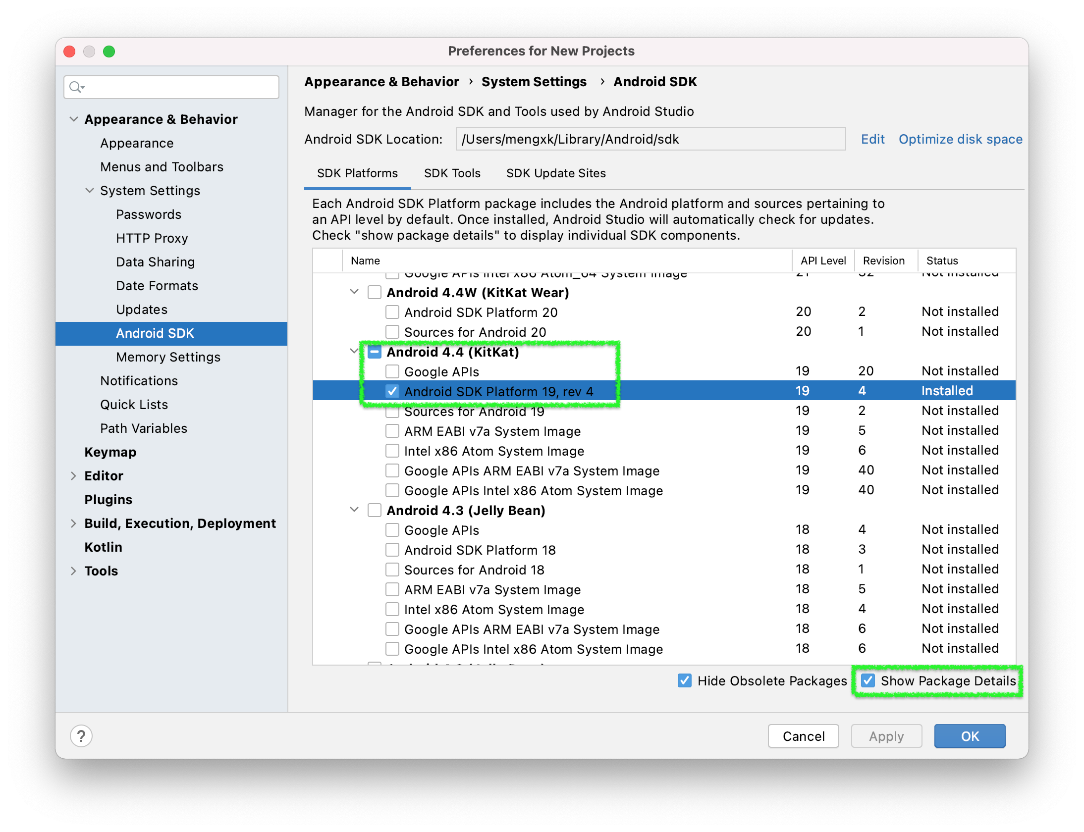 在 SDK Manager 中选择"SDK Platforms"选项卡,然后在右下角勾选"Show Package Details"。展开Android 4.4 (KitKat)选项,确保勾选了下面这些组件(你必须使用稳定的代理软件,否则可能都看不到这个界面):