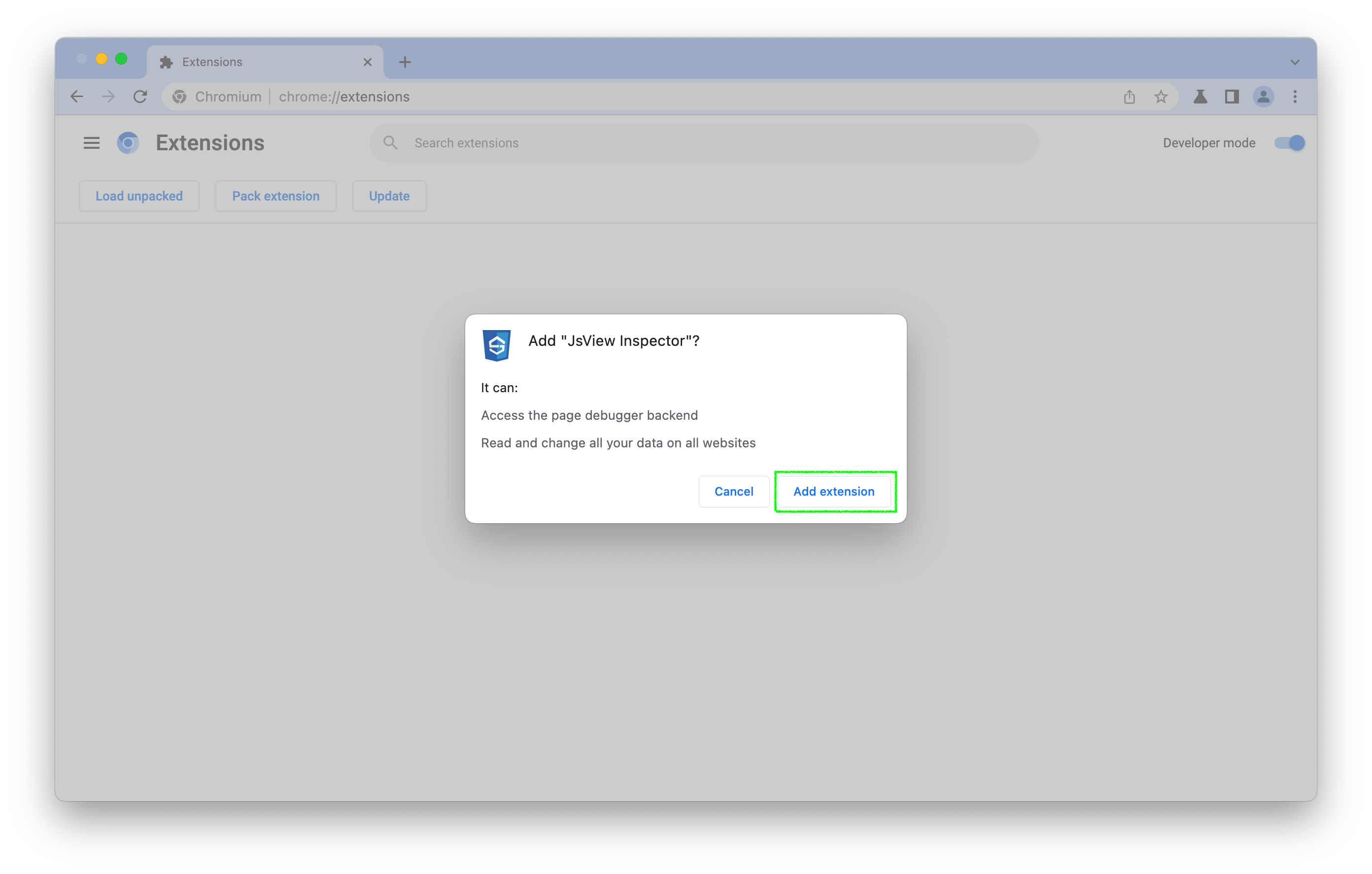 拖拽jsview-inspector插件到浏览器,并选择 Add extension。。