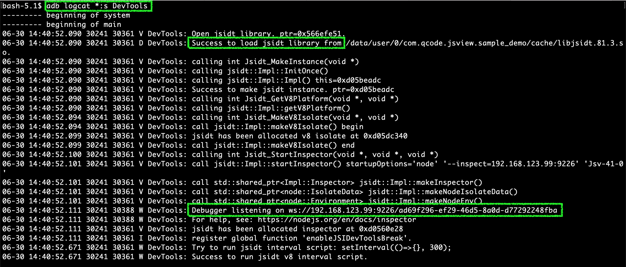 adb logcat -s DevTools看到 Debugger listening on ws:// 字样时,说明调试包成功加载,Android端的准备工作就完成了。