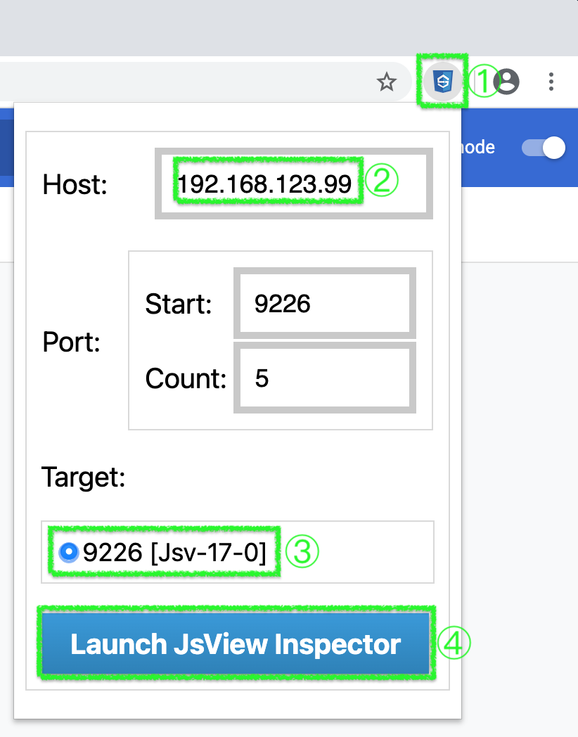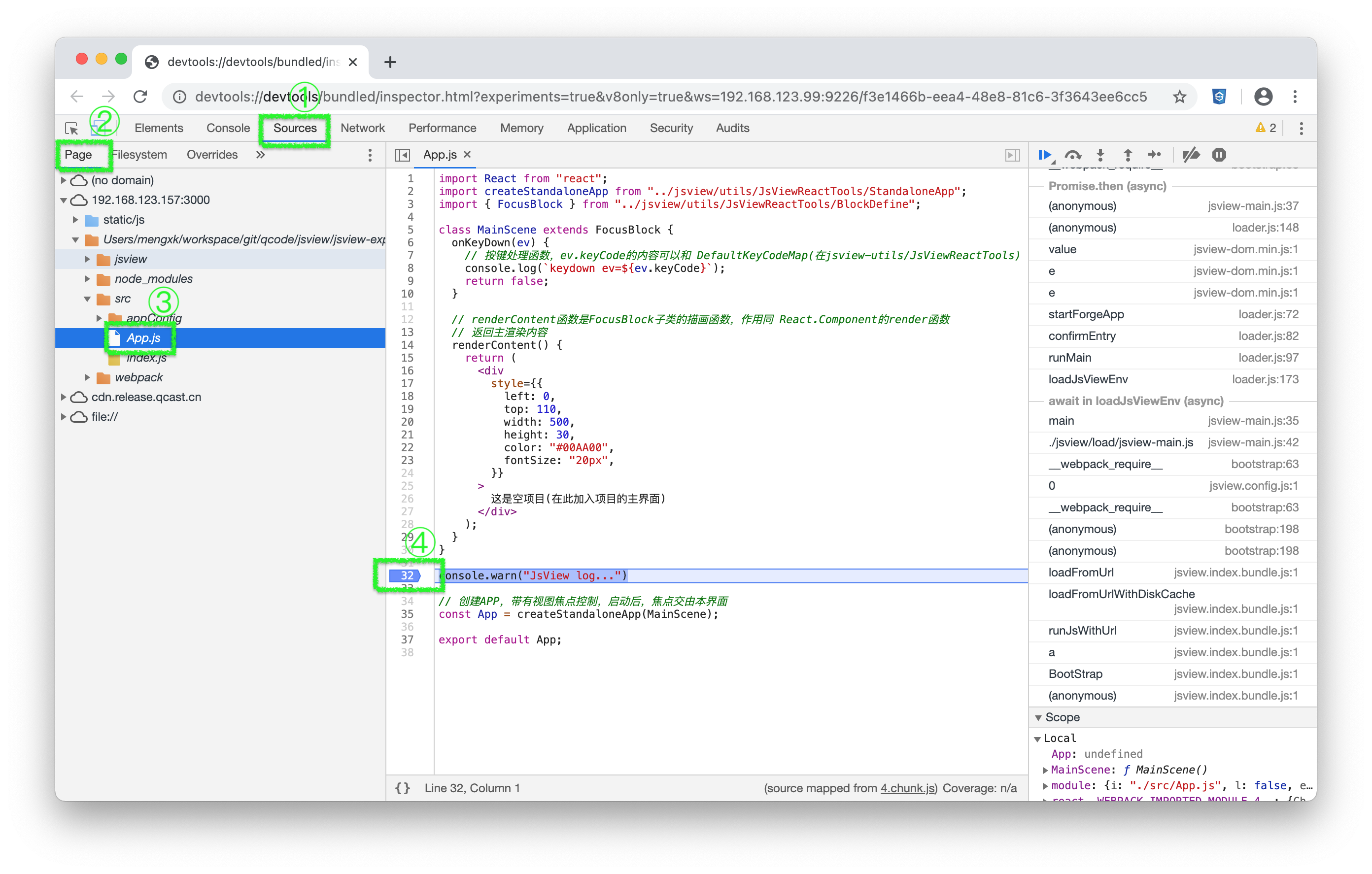 (4) 打开 JsView V8 Inspector 插件①,输入Android设备的ip②和端口(默认9226)扫描范围,等待扫描结果后选择可调式端口③,点击进入④。