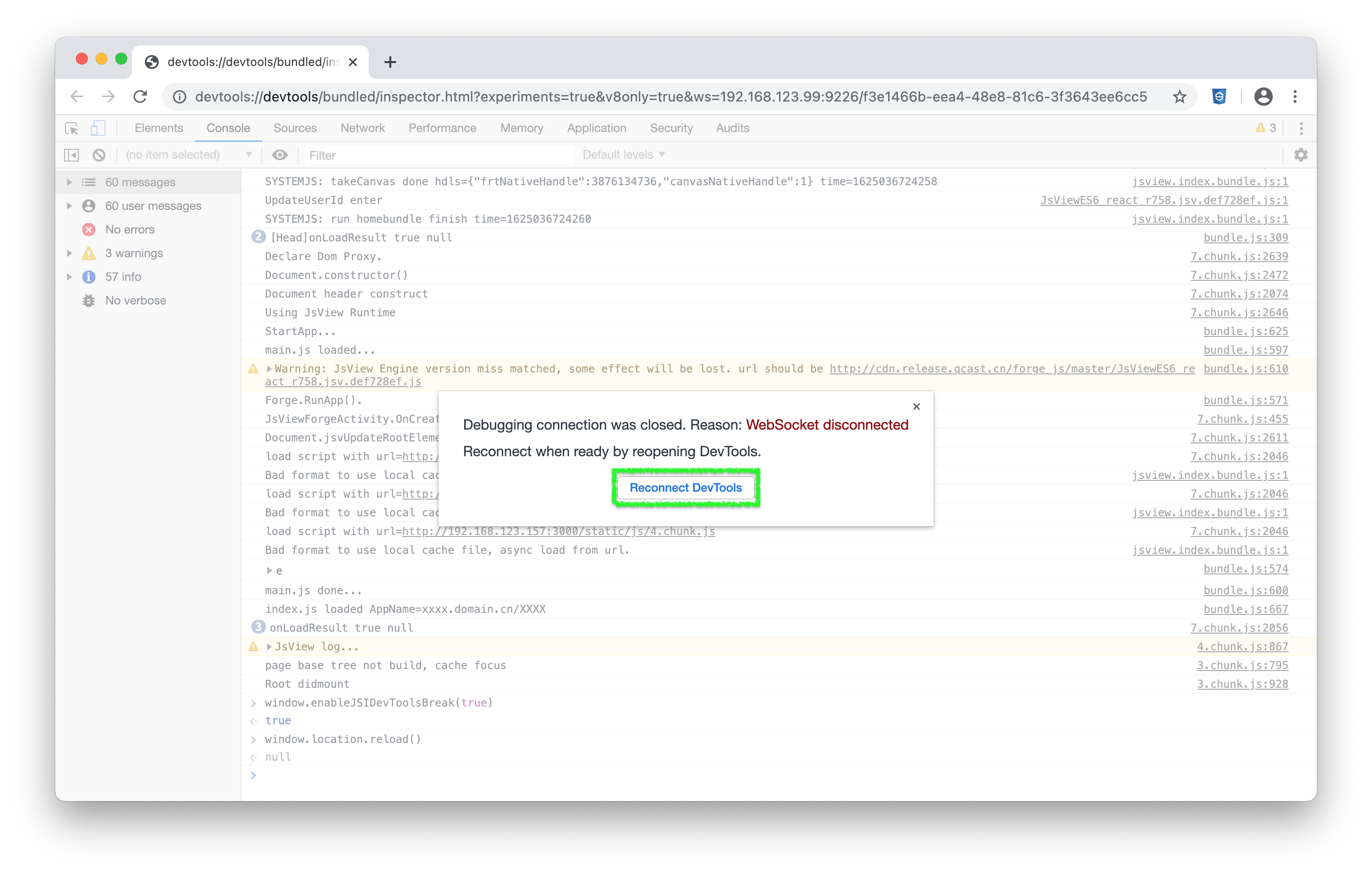 (3) Android设备的JsView重新加载不能通过刷新浏览器,而是需要你在Console中手动通知JsView刷新,如果你使用的是"[JSV测试]",也可以尝试双击遥控器的菜单键,在弹出的提示中选择"Reload"。当然,如果断点部分的代码尚未执行到(比如按键事件),那么你并不需要重新加载页面。
