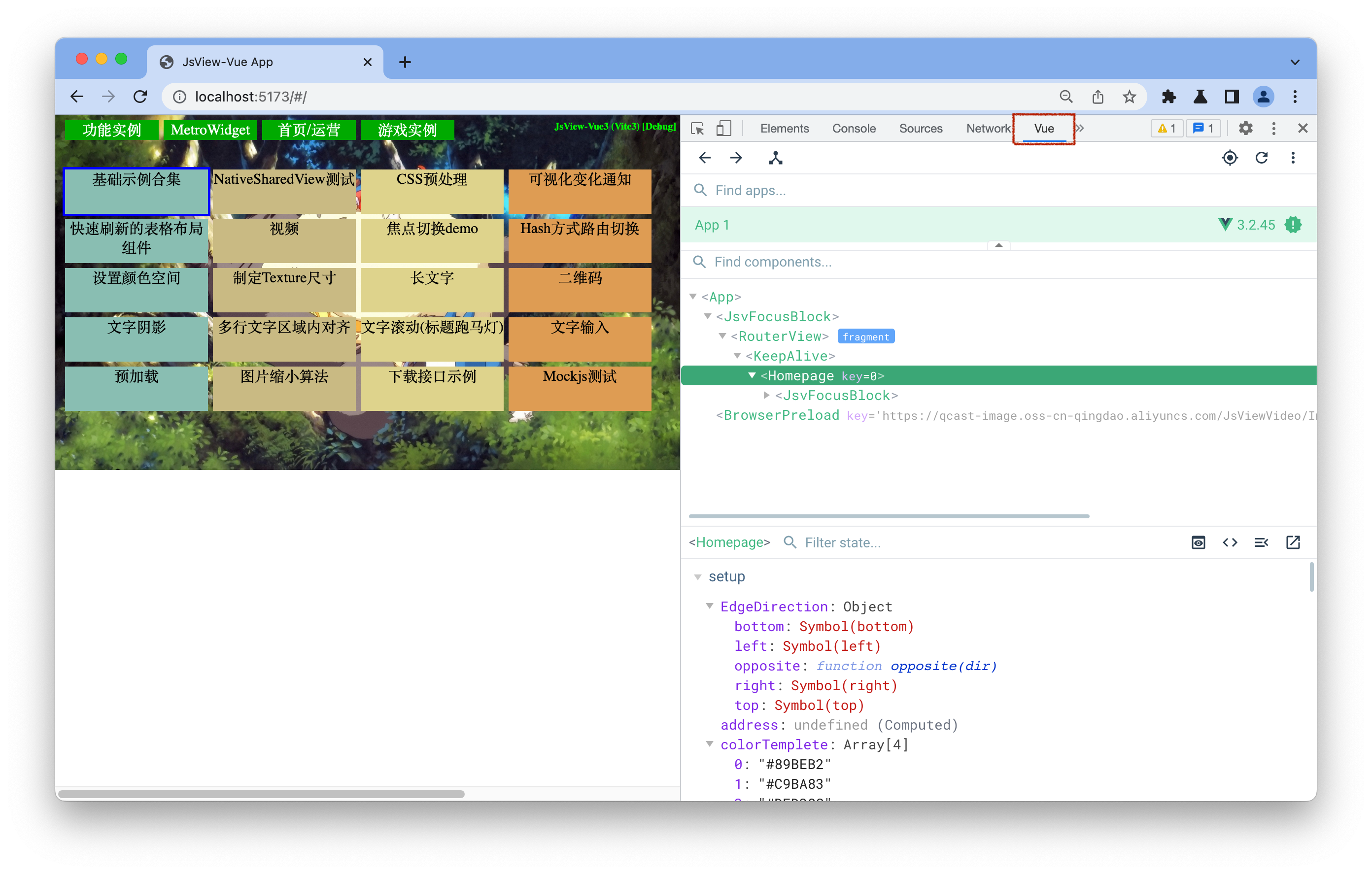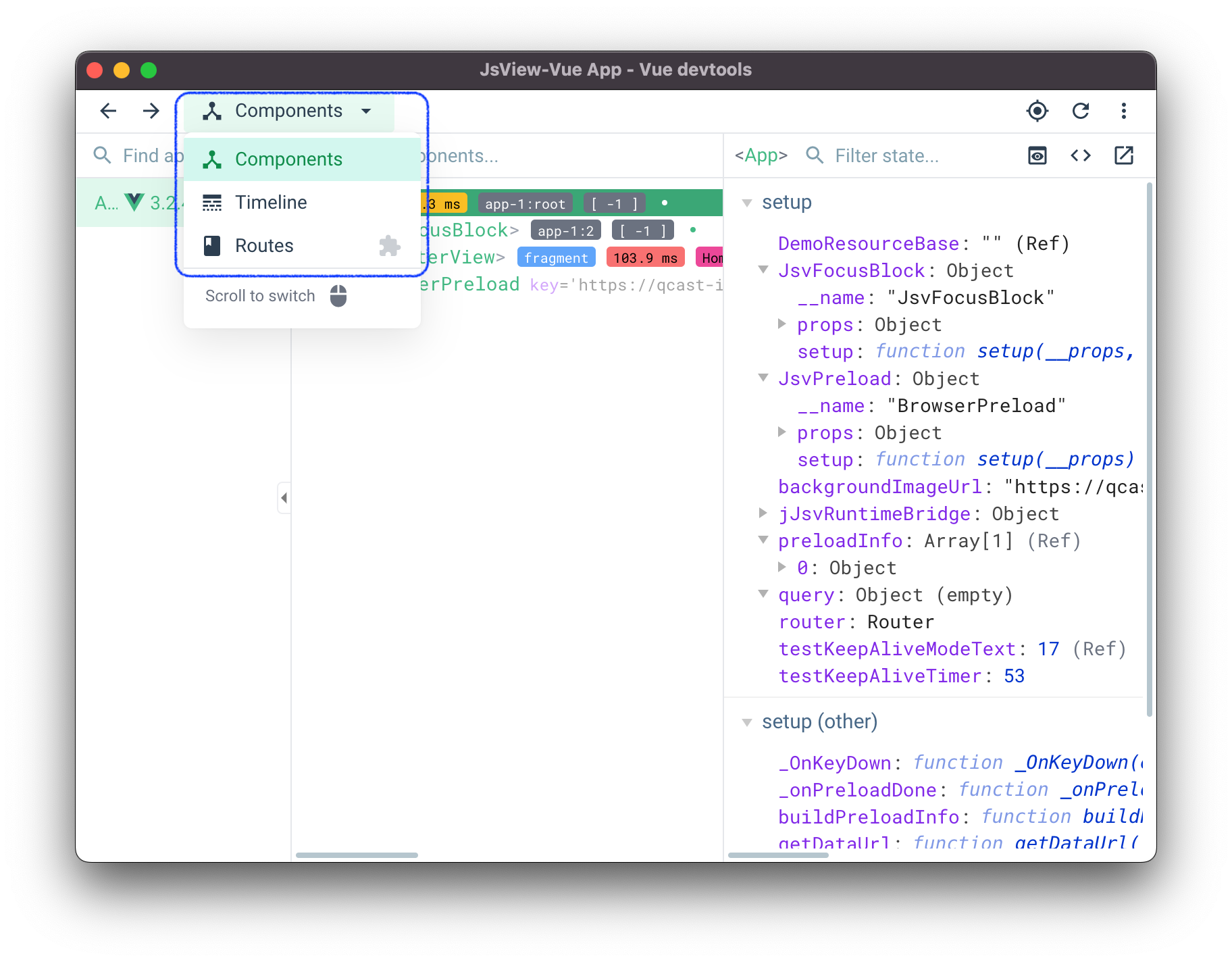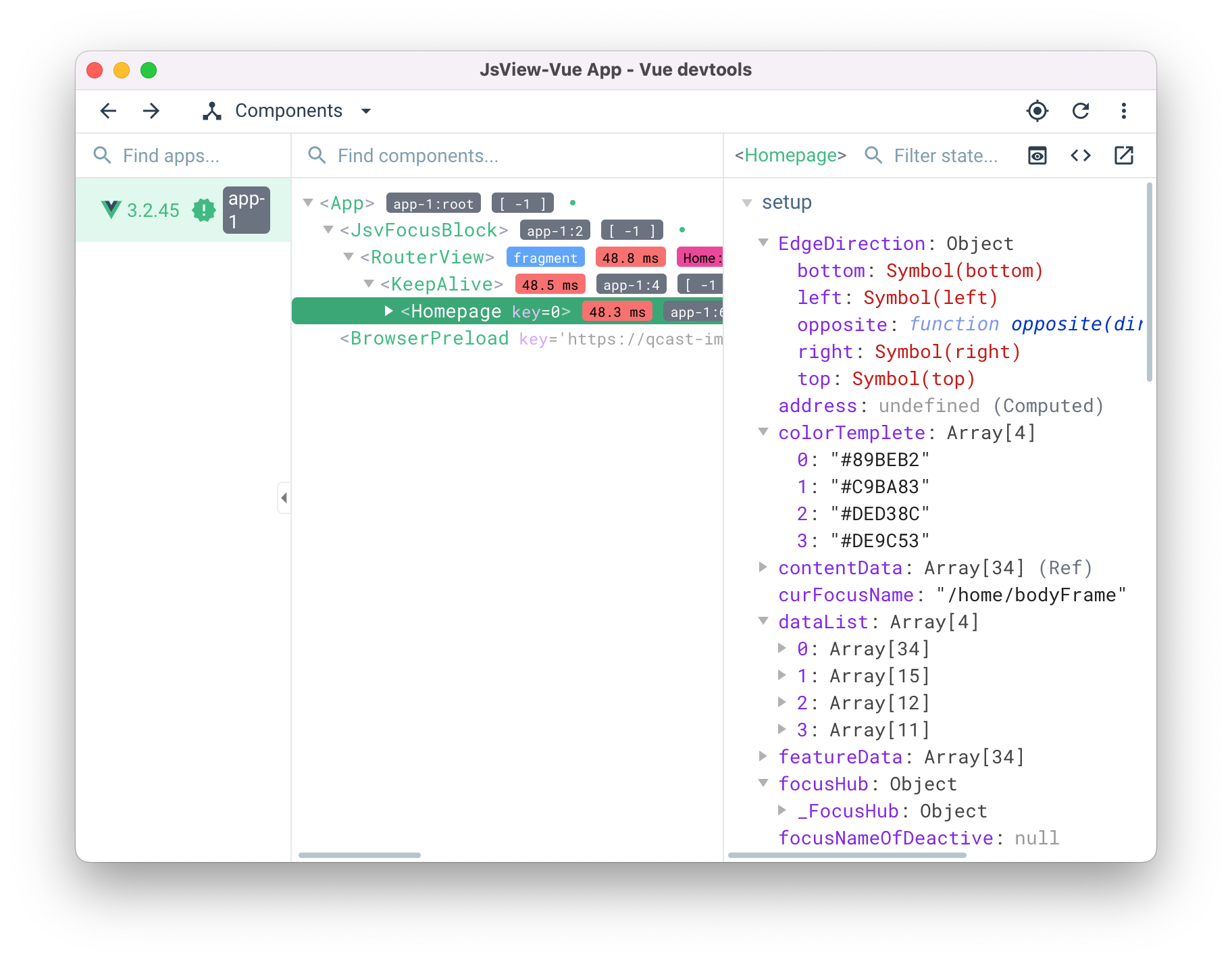 npm start或npm run dev运行调试服务并网页或设备中打开JsView后,可以看到 Vue DevTools App的调试信息。