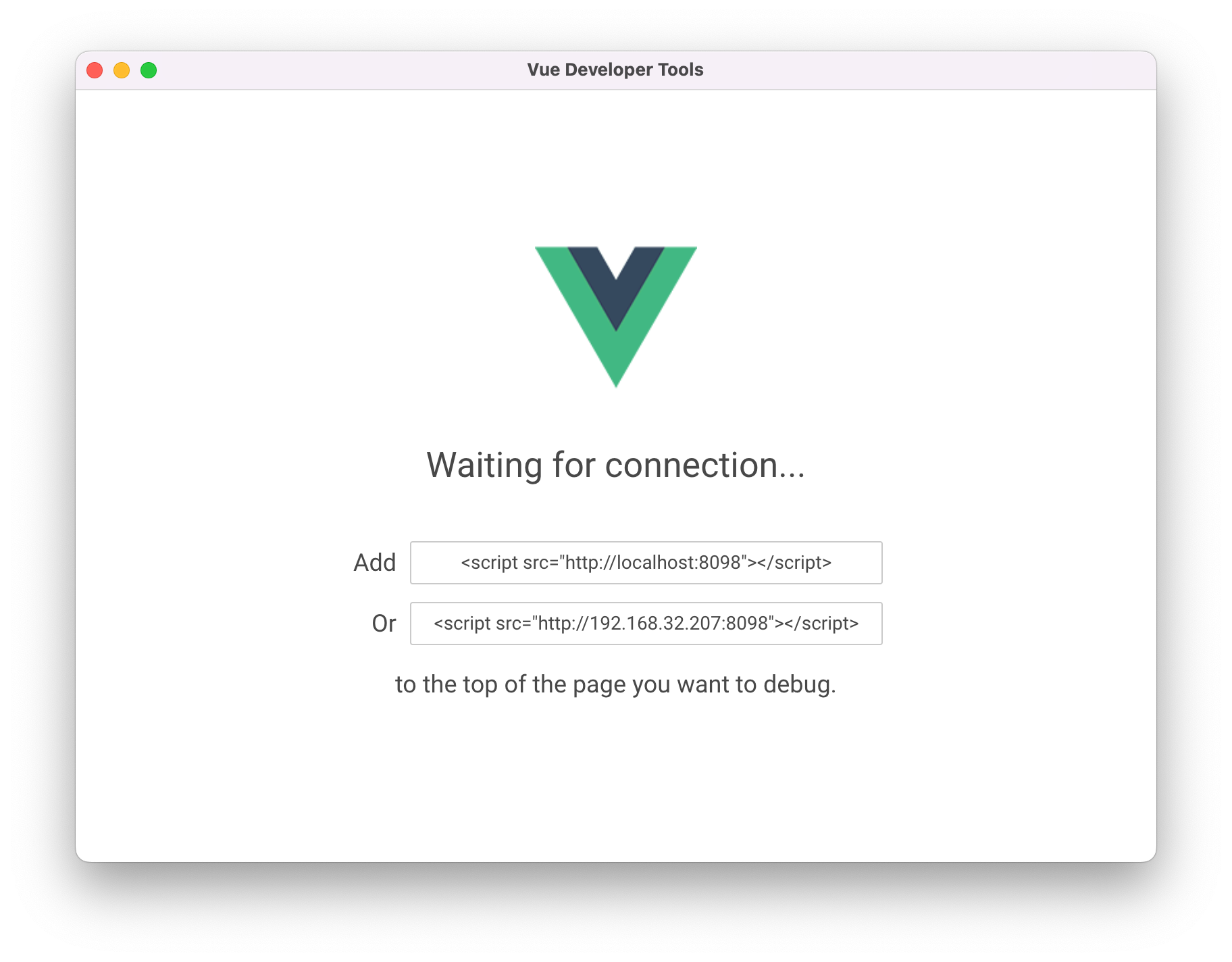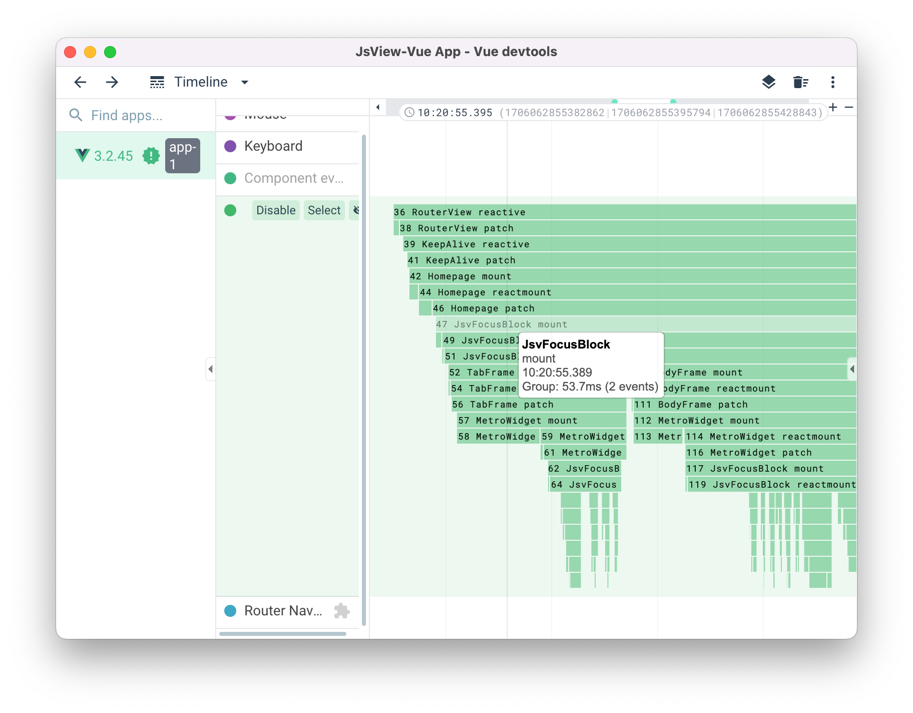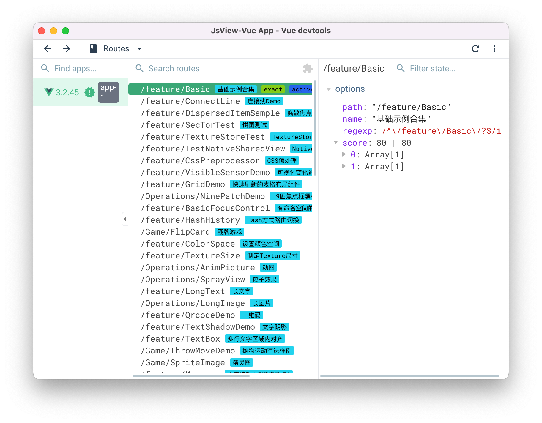npm start或npm run dev运行调试服务并网页或设备中打开JsView后,可以看到 Vue DevTools App的调试信息。