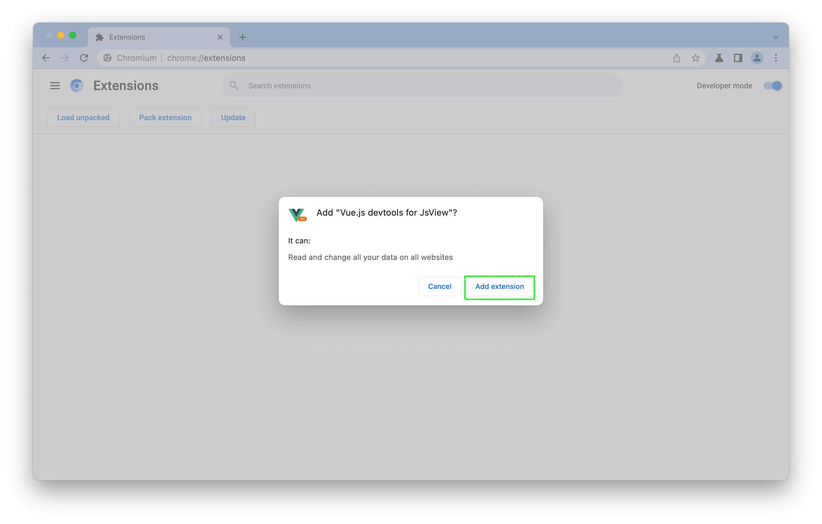 拖拽jsview-vuejsdt插件到浏览器,并选择 Add extension。。